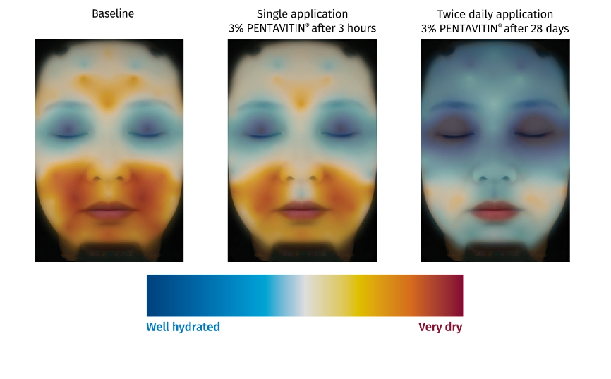 Thời gian và khả năng giữ ẩm của PENTAVITIN® 3% sau 28 ngày sử dụng cấp ẩm tốt cho vùng trán, mắt và cằm (nguồn dsm.com)
