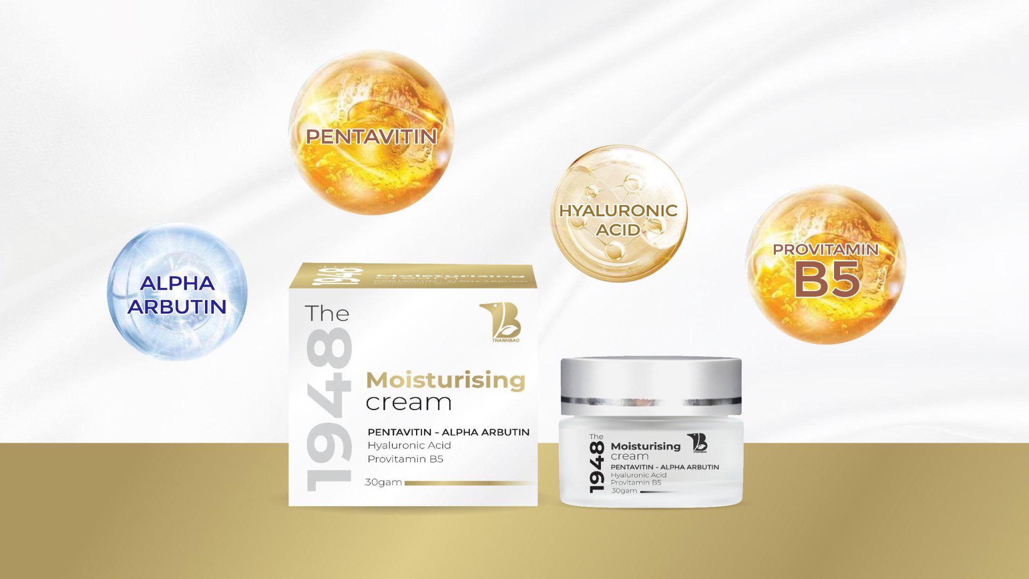 Kem Dưỡng Da Mờ Nám – The 1948 Moisturising Cream có chứa hoạt chất Pentavitin giúp cấp ẩm sâu cho da lên đến 72h, ngoài ra còn kết hợp với các thành phần như: Alpha Arbutin (làm sáng da, mờ nám) cùng cặp đôi cấp ẩm phục hồi Hyaluaronic Acid + Provitamin B5 càng làm tăng hiệu quả chỉ sau 1 lần sử dụng